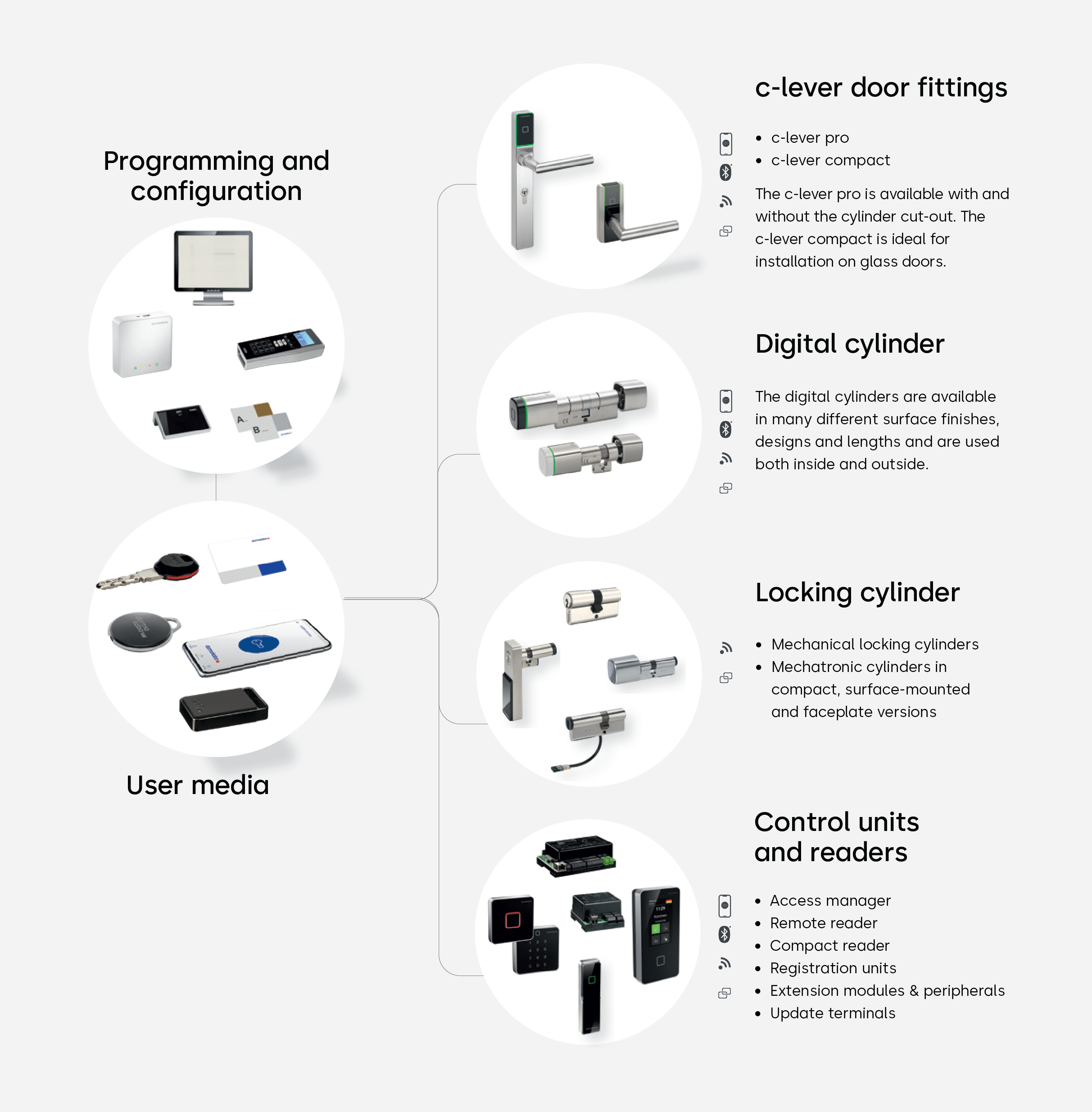 • Different media in one system: badges, mechanical keys, smart keys, smartphones, etc.