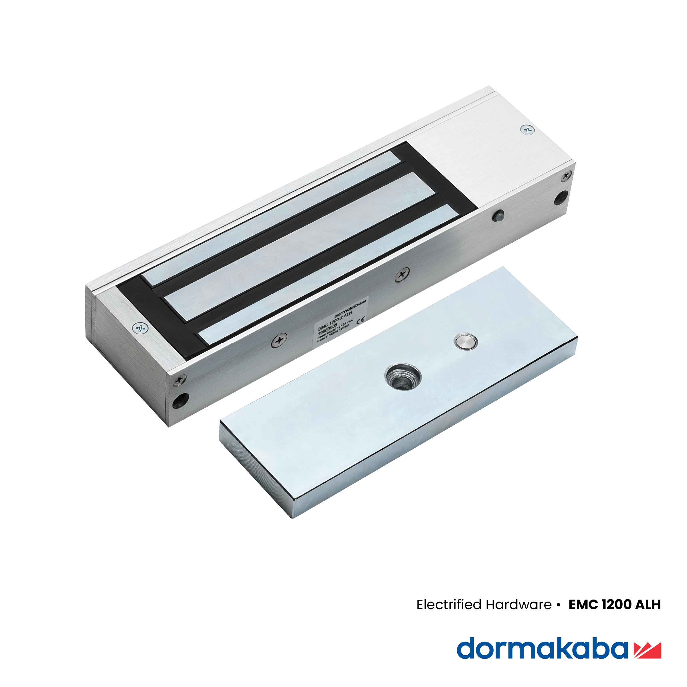 - EMC 1200-2 ALH: Double magnetic lock with 1200 lbf (5338 N) holding force per magnet, surface mount, with lock status sensor and red / green LED indicator, in anodised aluminum