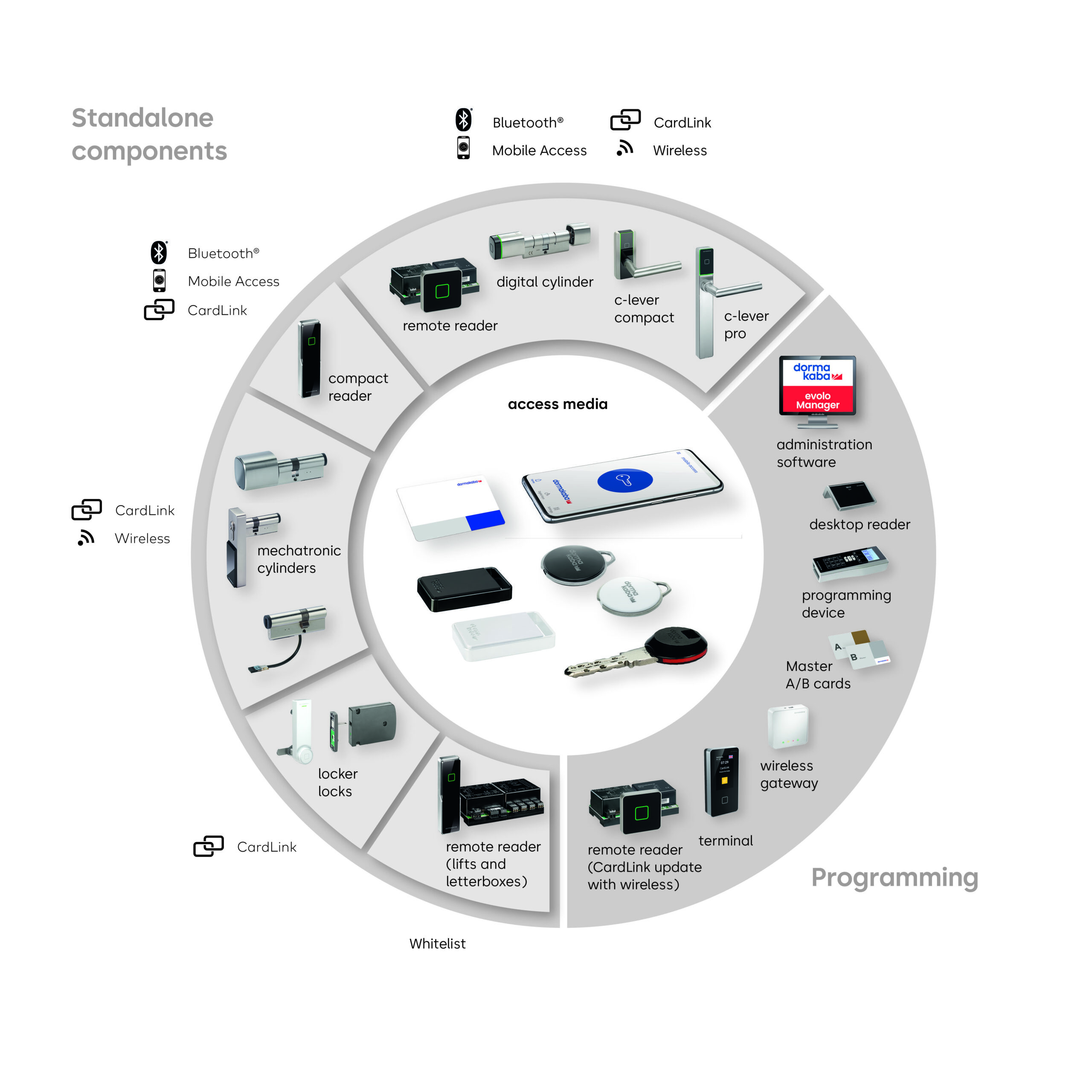 • Authorisation in the door component :Manual access authorisation using a programming card directly at the door. PC-controlled granting of access authorisation and transmission to the electronic door component via a programming device